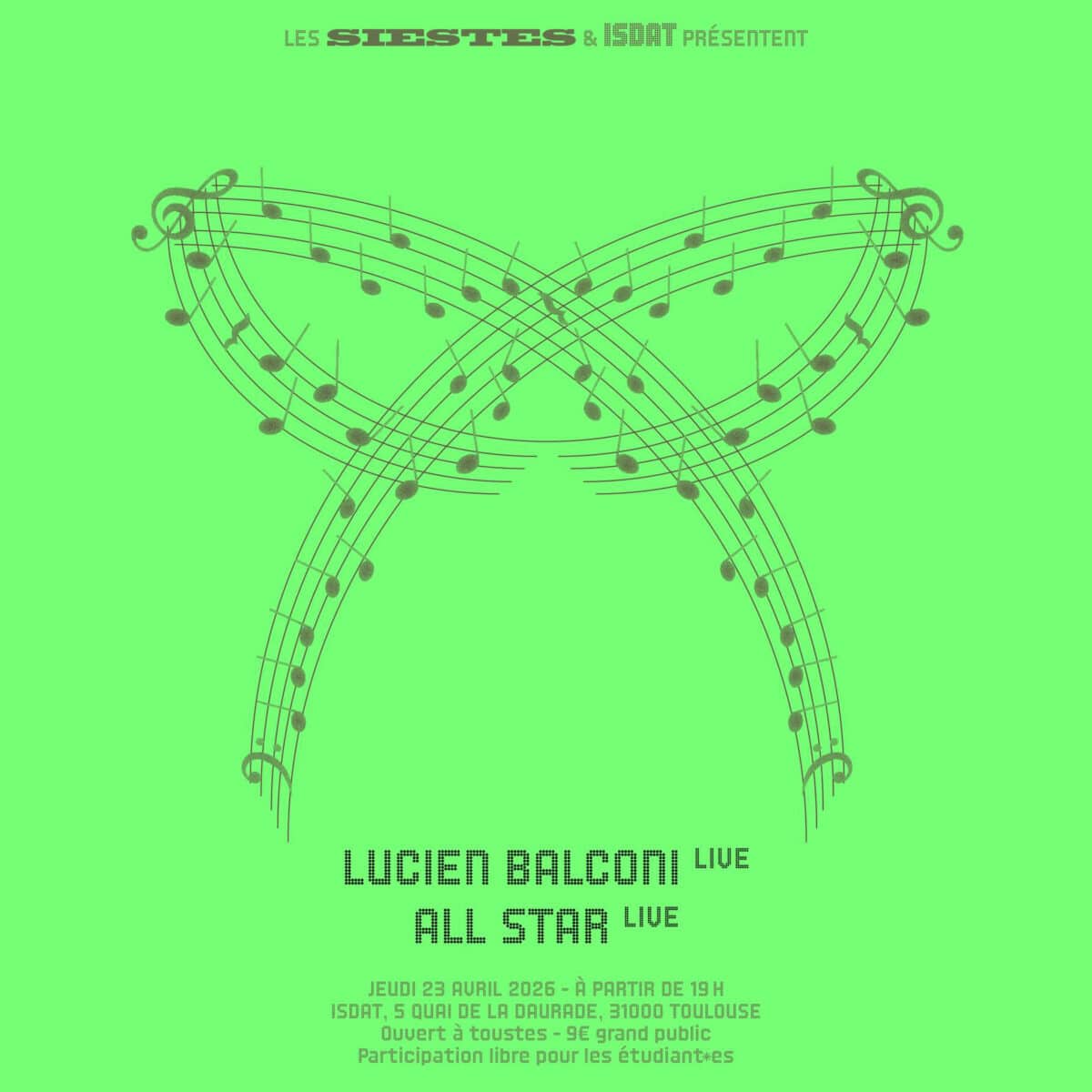♬ En marge des concerts, R E V, la radio étudiante de l’isdaT, diffuse en direct ! Des projets de recherche en signalétique, scénographie et diffusion sans fil seront également présentés.